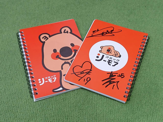 オレンジ色のかわいらしいコミックシーモアのノートに選手サインを入れてプレゼントします!