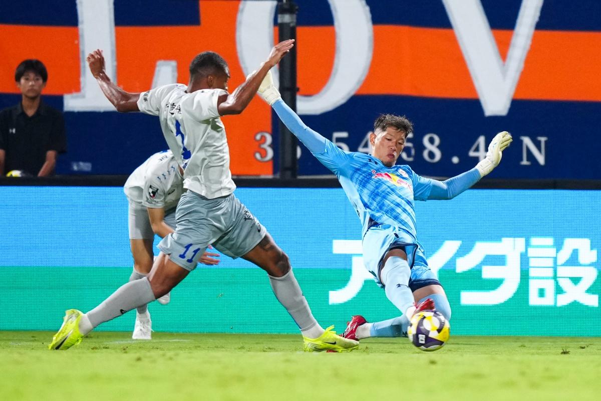 40分を過ぎると押し込まれる時間が長くなり、笠原の見せ場が訪れる。マルクス・ヴィニシウスのパスを受けたウェズレイ・タンキの左足シュートと、直後のタンキのヘディングを弾き、そのCKのこぼれ球を拾った弓場の低いシュートは、がっちりキャッチしてゴールを守った。ともにゴールを目指して勝負を仕掛け合う、息つく暇もない前半は、大宮の1点リードで終了した。