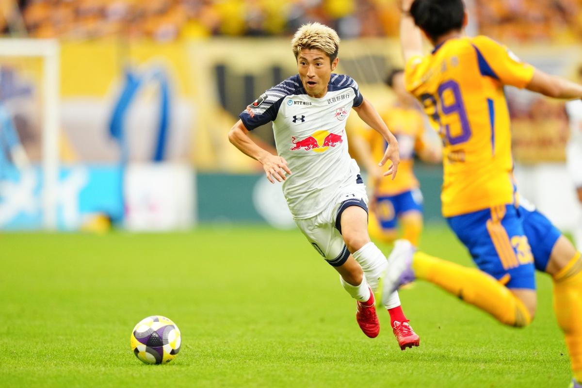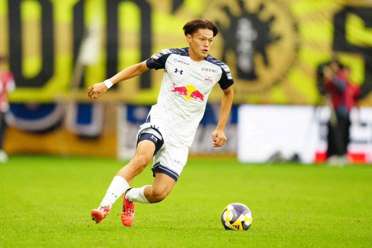 前節の磐田戦は、前半の立ち上がりに2失点して苦しいゲームだったのですが、逆転できてよかったですしホッとしています。前半の終わりのいい時間に1点返せたので、「まだ全然ある」とハーフタイムにみんなで話をしていました。後半の立ち上がりにすぐ決めることができたので、チームが勢いに乗って勝ち切ることができたのかなと思います。アシストの場面は、前半にアルトゥール(シルバ)からのパスで裏に抜け出したシーンもありましたし、あの背後のスペースは狙っていました。相手の選手にイエローカードも出ていたので、そこで自分がどんどん仕掛けていこうと考えていて、実際に結構行けた印象もありましたしよかったと思います。