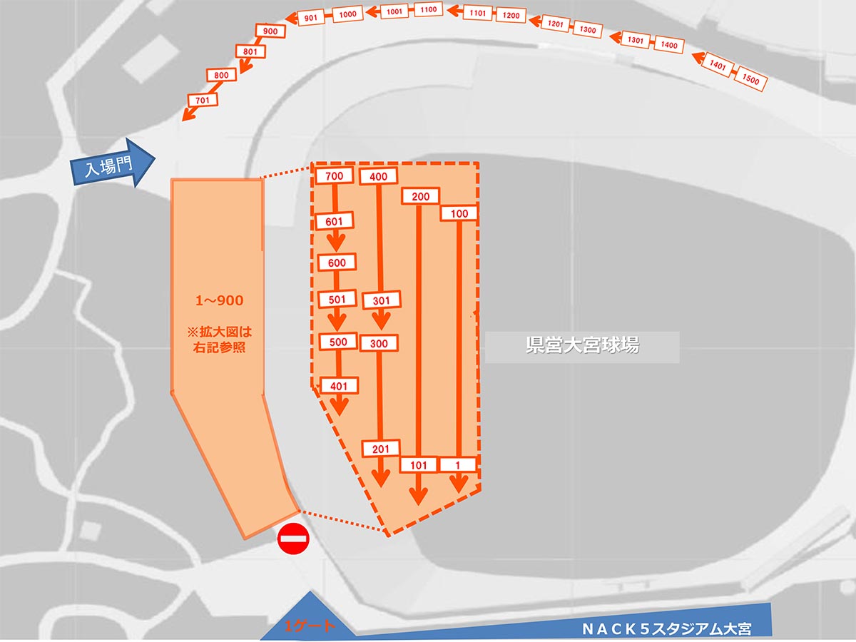 本抽選結果に基づき、キックオフ3時間15分前となる12時45分より整理券配布を実施いたします。12時45分までに係員の誘導のもと、抽選結果の整理番号順に待機列形成場所にお申込者様およびご同伴者様全員でお並びください。待機列形成場所はお申込時に選択した入場ゲート、整理番号によって異なりますので、ゲート1から入場される方は下図をご確認ください。ゲート2から入場される方はゲート2前階段下にお並びください。