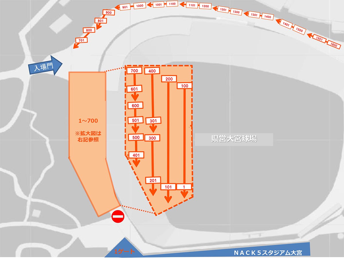 本抽選結果に基づき、キックオフ3時間15分前となる12時45分より整理券配布を実施します。12時45分までに係員の誘導のもと、抽選結果の整理番号順に待機列形成場所にお申込者様およびご同伴者様全員でお並びください。待機列形成場所はお申込時に選択した入場ゲート、整理番号によって異なりますので、ゲート1から入場される方は下図をご確認ください。ゲート2から入場される方はゲート2前階段下にお並びください。