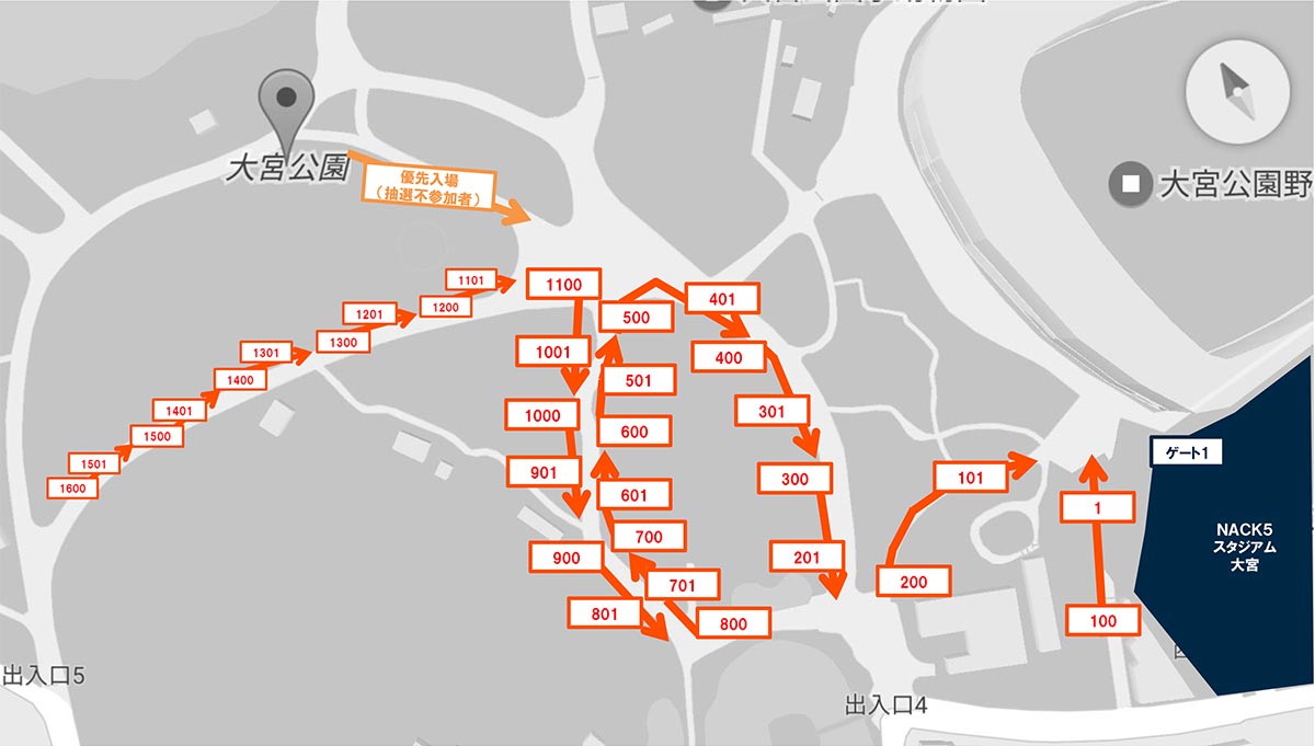 本抽選結果に基づき、キックオフ3時間15分前となる12時45分より整理券配布を実施します。12時45分までに係員の誘導のもと、抽選結果の整理番号順に待機列形成場所にお申込者様およびご同伴者様全員でお並びください。待機列形成場所はお申込時に選択した入場ゲート、整理番号によって異なりますので、ゲート1から入場される方は下図をご確認ください。ゲート2から入場される方はゲート2前階段下にお並びください。