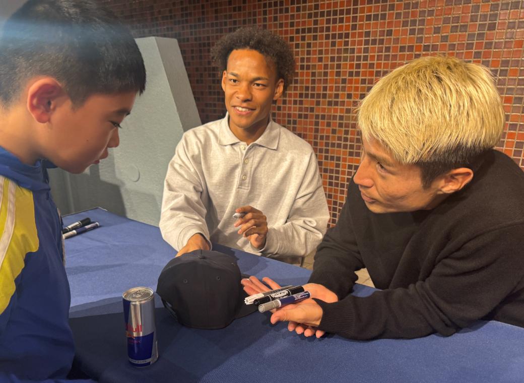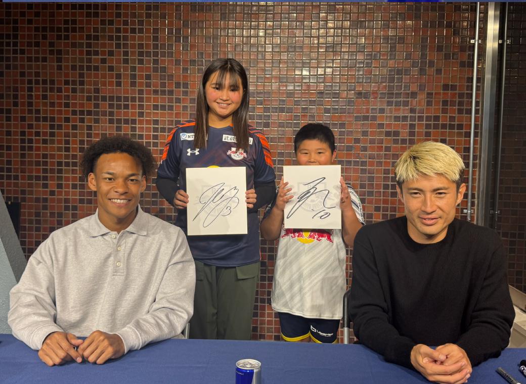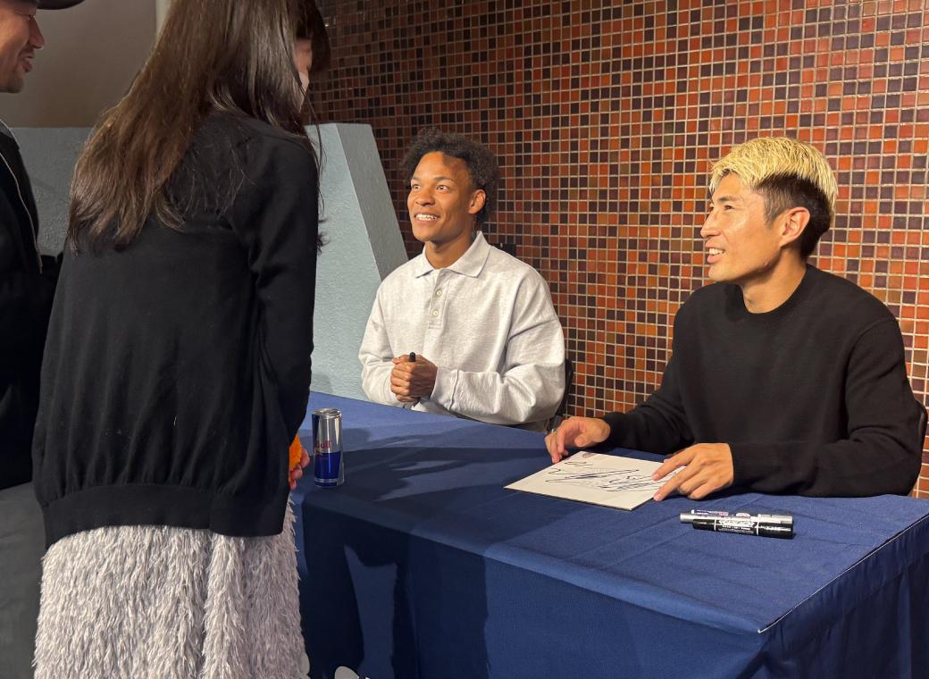 店内は、多くのファン・サポーターで賑わいました。イベントがスタートすると、選手との対面を心待ちにしていた様子が皆さまからひしひしと伝わってきました。参加者の皆さま一人ひとりに当日ご購入いただいた商品やご自身でお持ちしたアイテムに直筆サインを書き、直接お渡ししました。また、写真撮影会では両選手ともに穏やかな笑顔で記念撮影に応じていました。