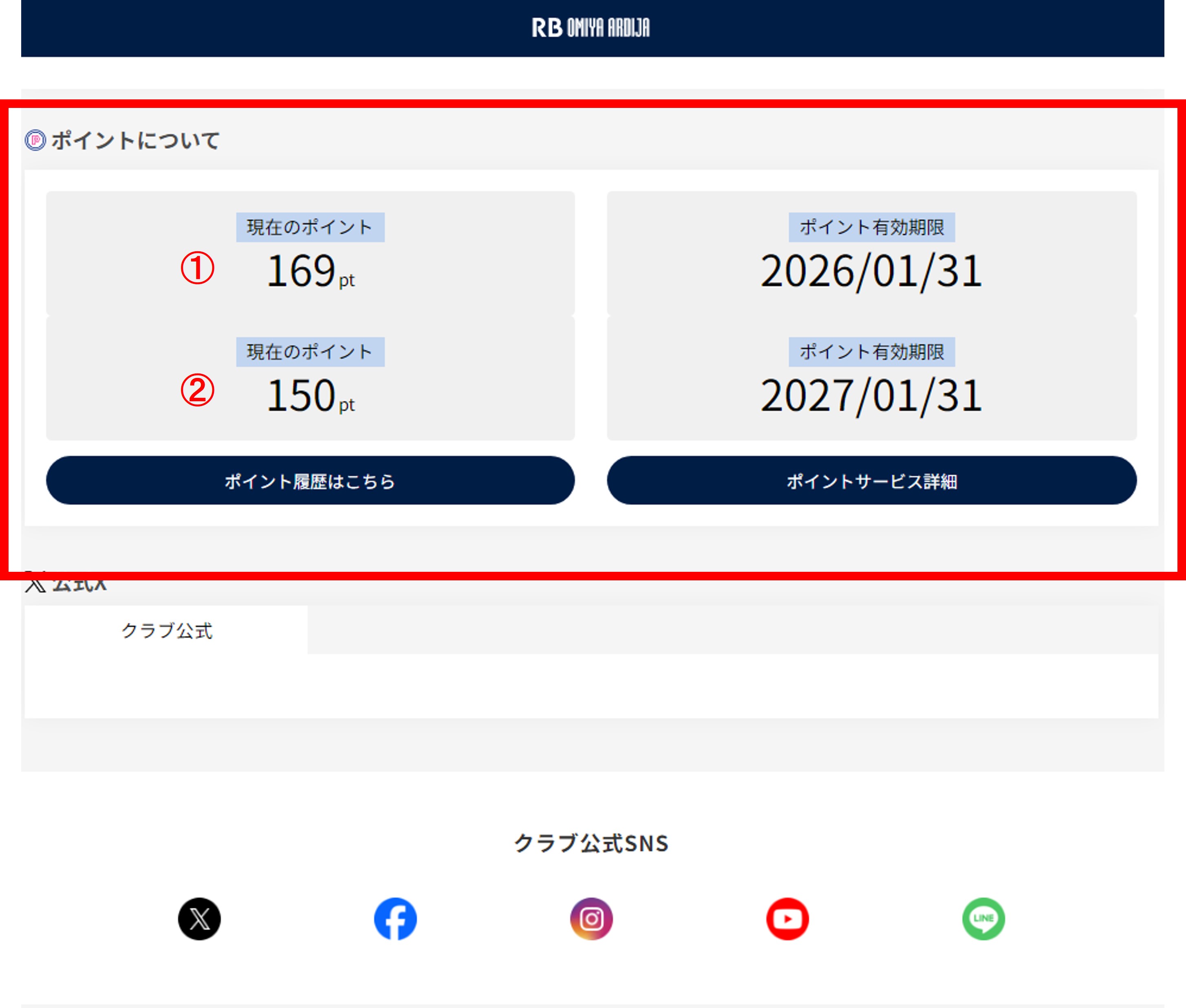 クラブ公式サイトよりマイページにログインしていただき、下にスクロールするとポイントを確認できます。1と2を合算した数が、保有ポイント数となります。
