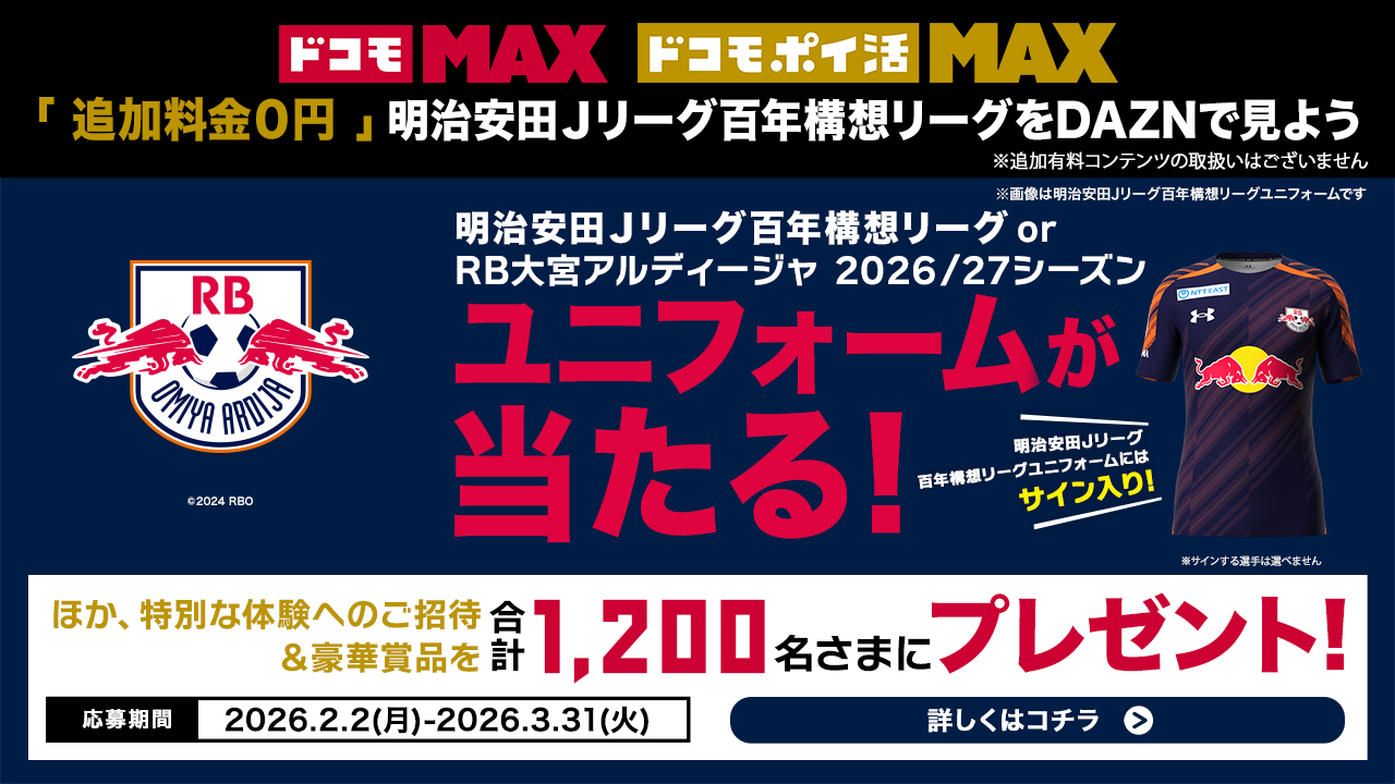 スポーツファン必見の動画配信サービス「DAZN」が、ドコモの料金プラン「ドコモ MAX」もしくは「ドコモ ポイ活 MAX」なら追加料金なしで見放題に。さらにRB大宮アルディージャの指定バナーもしくは指定URL経由でこの料金プランにお申込みいただくと、ご契約金額の一部がクラブへ強化費用として寄付されます。※追加有料コンテンツの取扱いはありません。