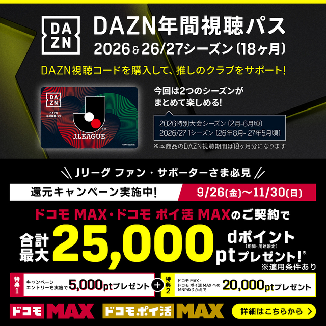 「DAZN年間視聴パス2026 & 2026/27シーズン」数量限定販売および「ドコモ MAX」dポイント5,000pt還元キャンペーン実施のお知らせ