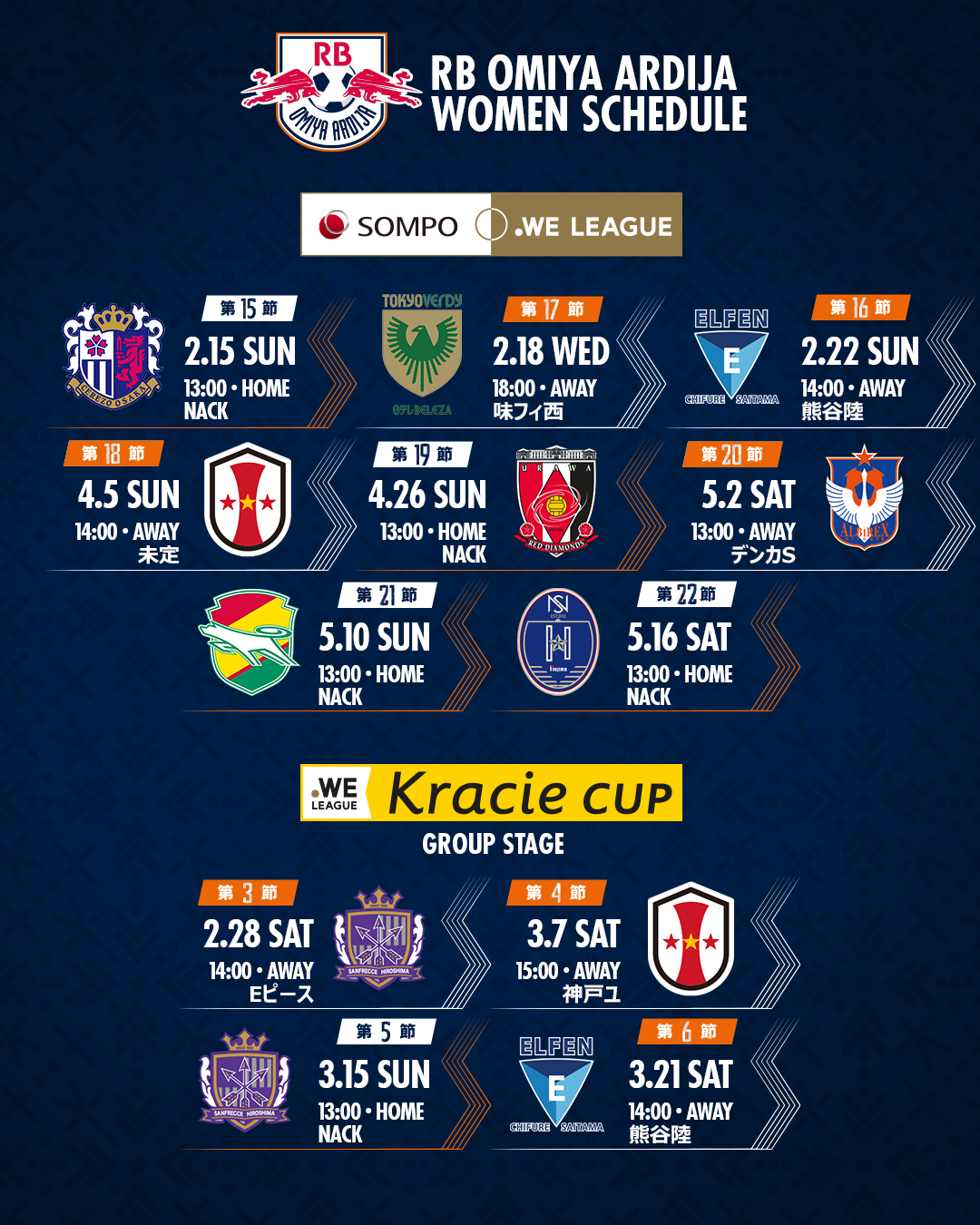 ※2025/26 SOMPO WEリーグ 第17節に関しましては、対戦クラブである日テレ・東京ヴェルディベレーザがAFC Women's Champions League 2025/26に出場するため、2/18(水)開催となります。