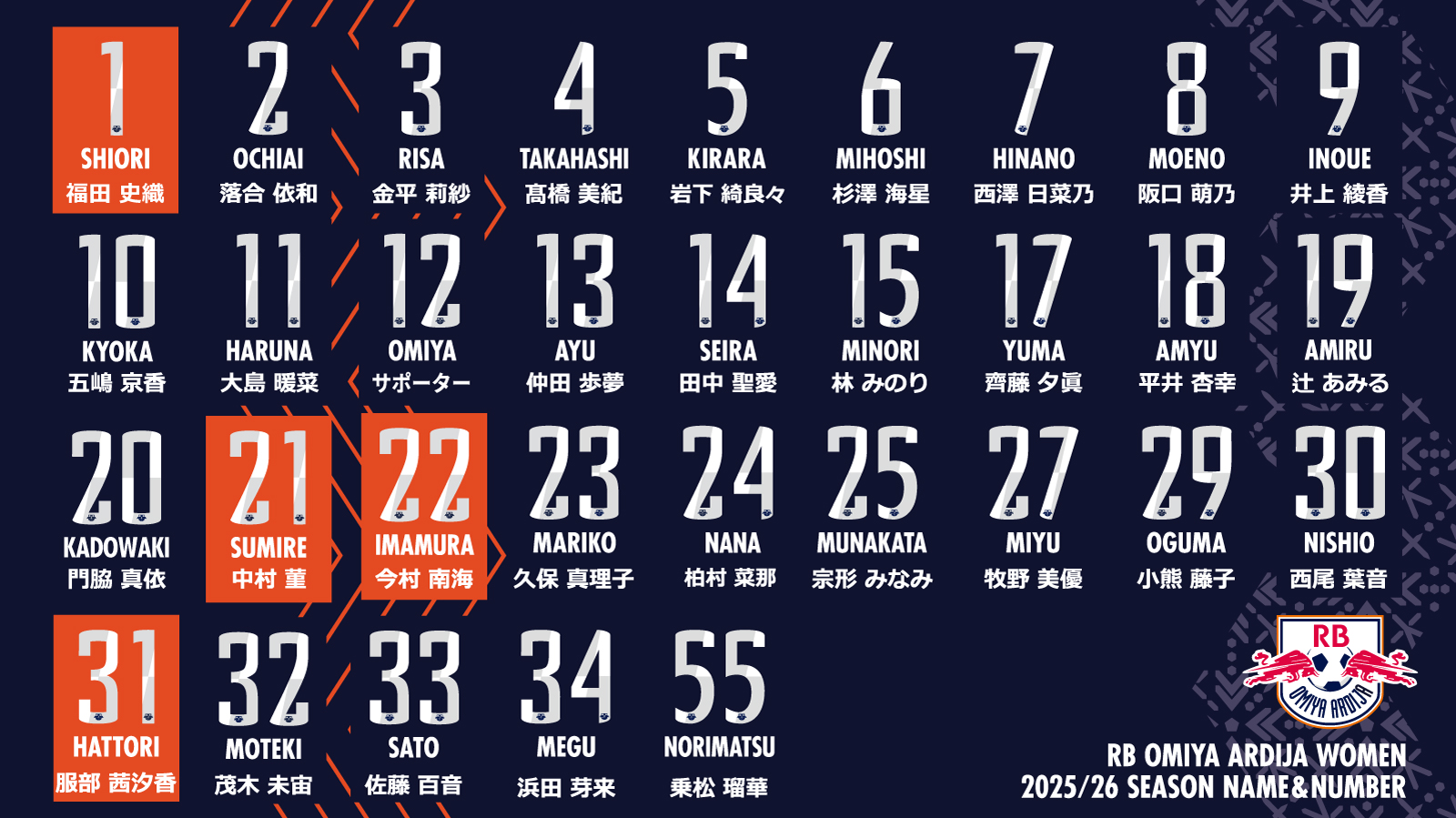 RB大宮アルディージャオリジナルナンバーフォントにエンブレムをデザインしたネーム&ナンバーシートでの圧着加工になります。FP1st(ネイビー)およびGK1st(オレンジ)はホワイト&グレーシート、FP2nd(グレー) はブルーシートでの圧着加工になります。ユニフォームご注文時に同時にお申込いただけます。
