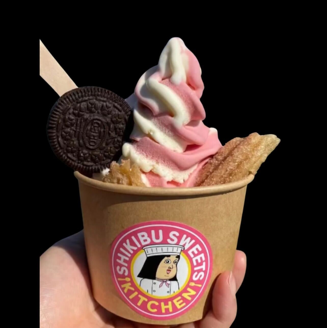 外はサクッと、中はもっちり。出来たてチュロスにひんやりソフトクリームを乗せた、しきぶちゃん特製スイーツ「チュロ・ソフ」。あつあつ×ひんやりの幸せコンビをぜひお楽しみください!