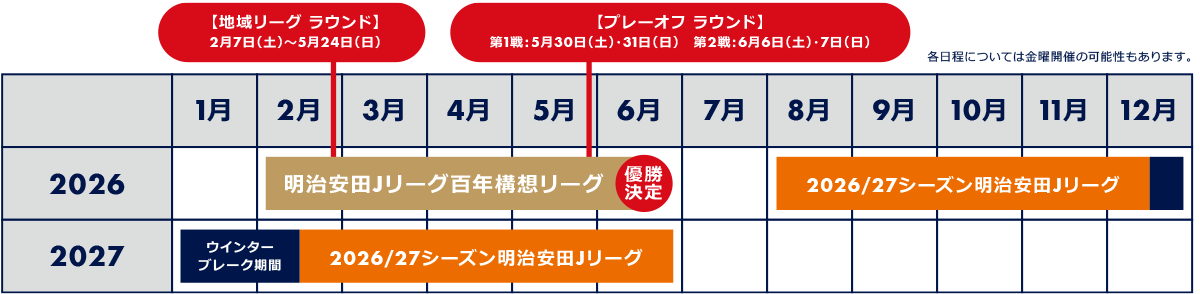 2026年は、8月に開幕する「2026/27シーズン明治安田Jリーグ」(2026年8月~2027年6月予定)からのシーズン移行に向けて、2026年前半(2~6月)に特別シーズンとして「明治安田Jリーグ百年構想リーグ」が開催されます。