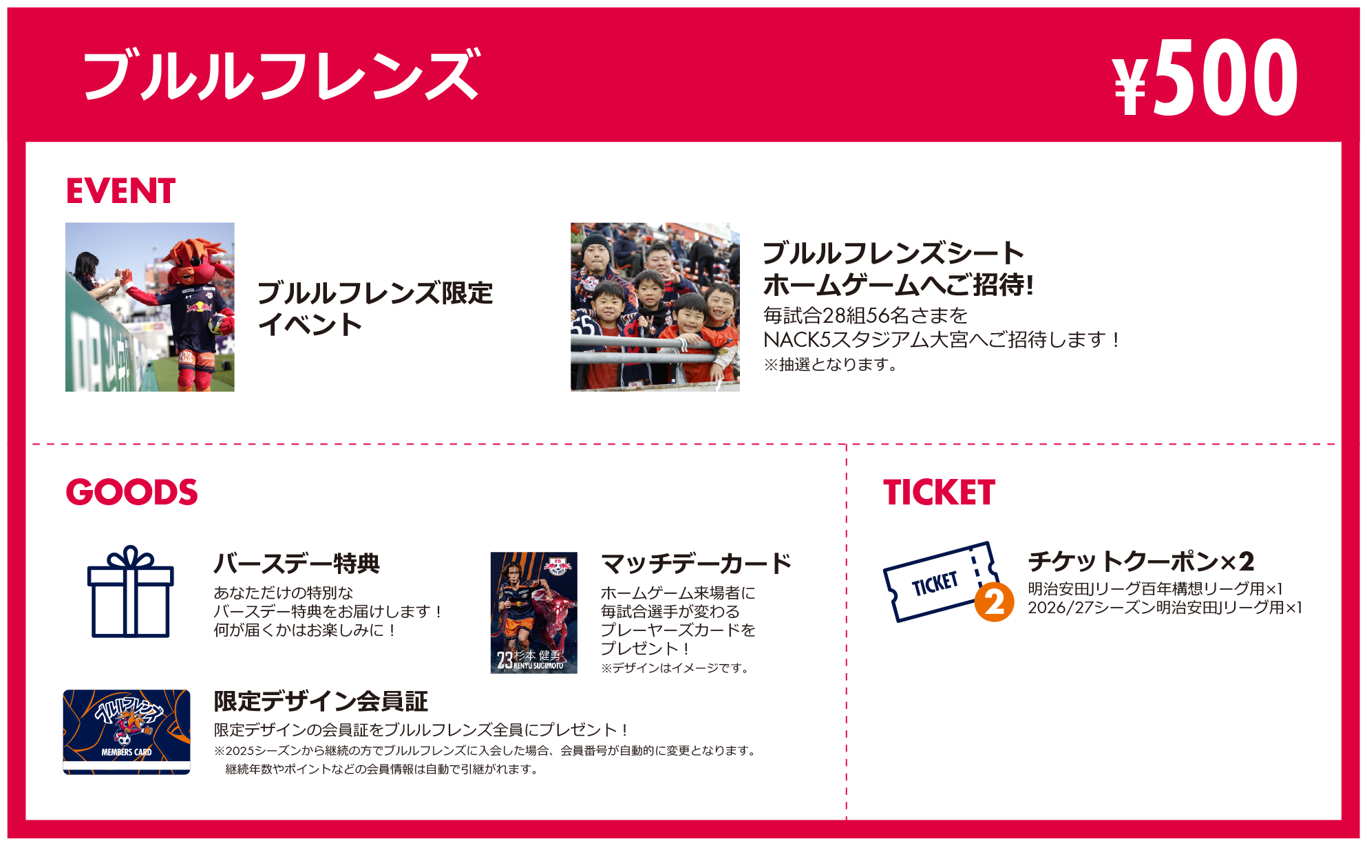 - 2025シーズンファンクラブ会員の方で、明治安田Jリーグ百年構想リーグ(2〜6月)は未入会、2026/27シーズン明治安田Jリーグに入会予定の方は、2025シーズンファンクラブ会員証を利用しますので大事に保管しておいてください。