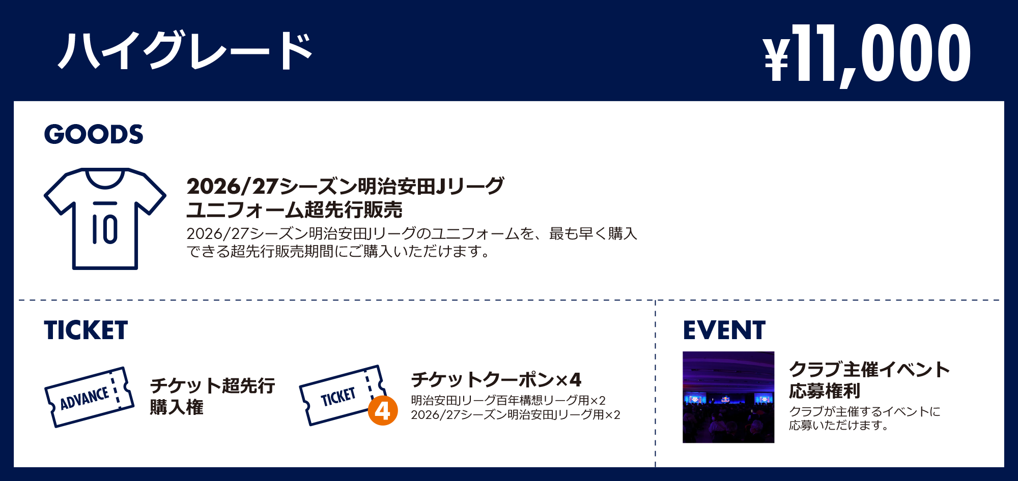 「明治安田Jリーグ百年構想リーグ」と「2026/27シーズン明治安田Jリーグ」を併せた1.5シーズンで販売します。