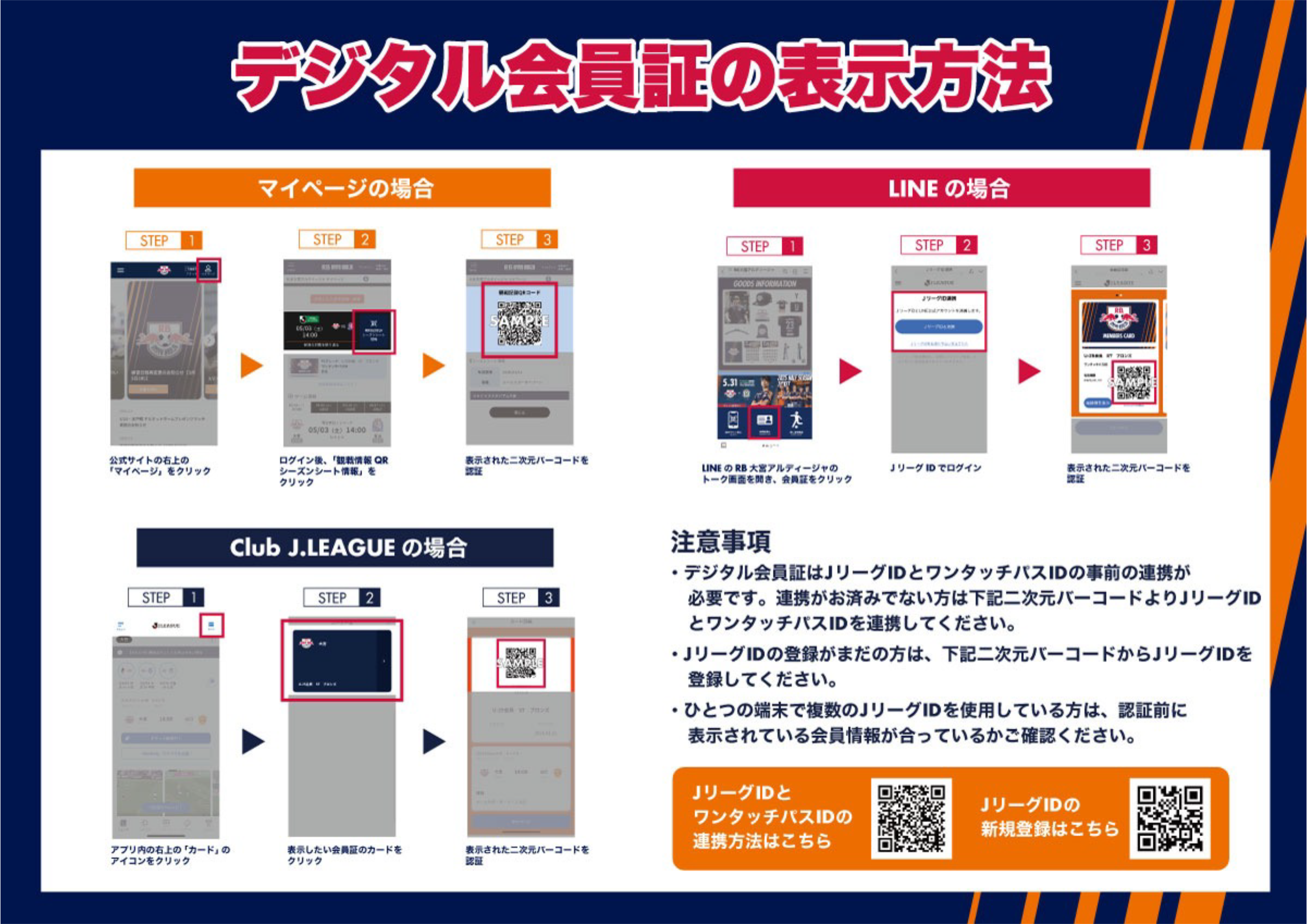 電子会員証は、JリーグIDとワンタッチパスIDを紐づけることでご利用いただけます。表示までの手順は以下をご確認ください。