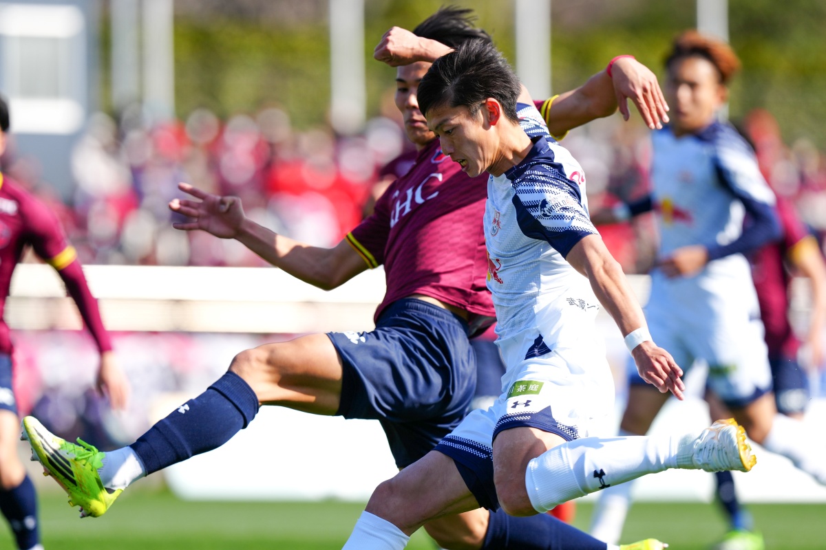22分、跳ね返されたロングスローを茂木が入れ直すと、ファーサイドにこぼれたところを泉が狙う。これは相手GK佐々木に弾かれたが、先制点への期待が高まるシーンだった。その後は、中山が倒されて得たFKを加藤聖が狙い、相手のシュートをトム・グローバーがセーブし、泉はカットインから、中山はこぼれ球を拾ってからゴールを脅かすが、スコアは動かない。