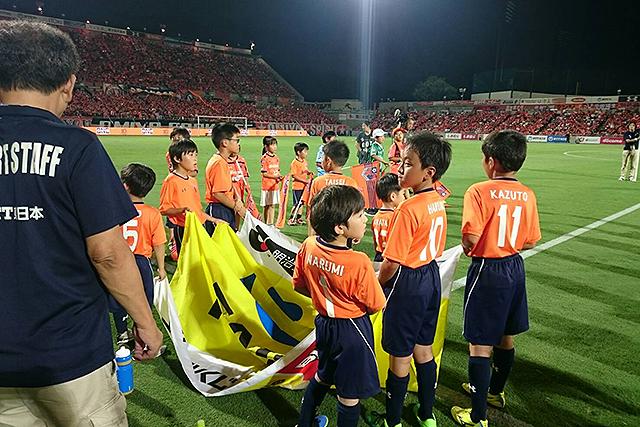 普段は入ることのできないNACK5スタジアム大宮のピッチで、ウォーミングアップに向かうアルディージャの選手達をハイタッチで送り出したり、選手入場時にフラッグべアラーやマスコットエスコートキッズとしてピッチ上の演出に参加したり、試合で実際に使う公式試合球を審判団に渡したりと、試合に臨むトップチームの選手たちの真剣な表情を間近で見て、サポーターの大声援の迫力を感じながら、見事に大役を果たしました。夏休み最後のホームゲームで味わった雰囲気は、子どもたちにとって、きっと忘れられない思い出となったことと思います。