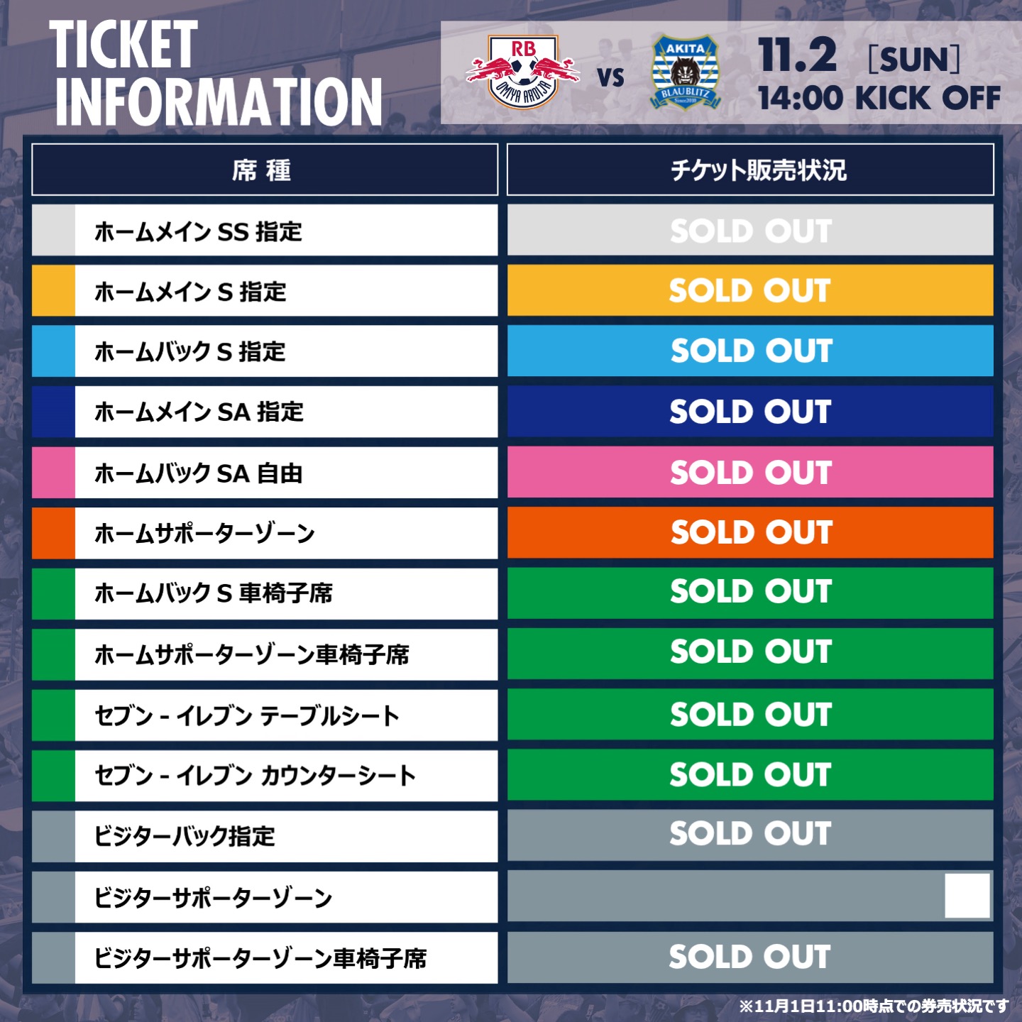 【追記・再掲】11/2・秋田戦 一部席種販売予定枚数終了のお知らせ