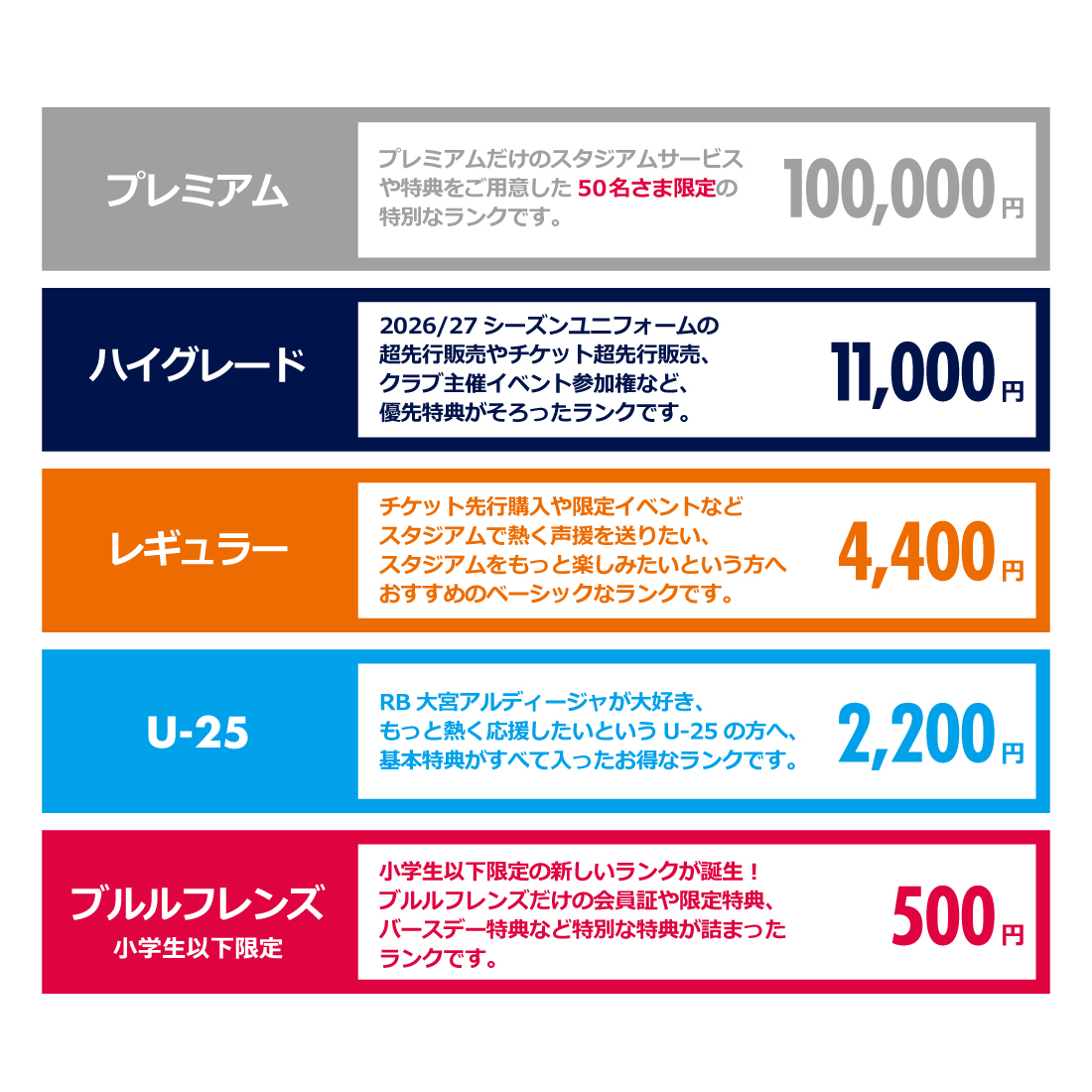 ・2025シーズンをもって継続年数に応じた会員ランク制度を廃止し、2026年以降よりご自身の観戦スタイルや楽しみ方に合わせてお選びいただける内容にリニューアルします。ランクに応じて、参加できる限定イベントや来場ポイントが異なります。