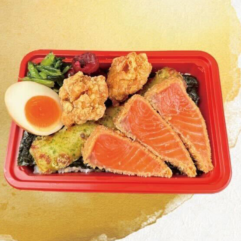 特製出汁醤油で漬けにしたサーモンのレアカツ。溶け込んだ旨味と二つの食感が口の中に溢れる逸品となっております。試合に"勝つ"とカツでゲン担ぎとしても人気のお弁当です。この機会にぜひご賞味ください。