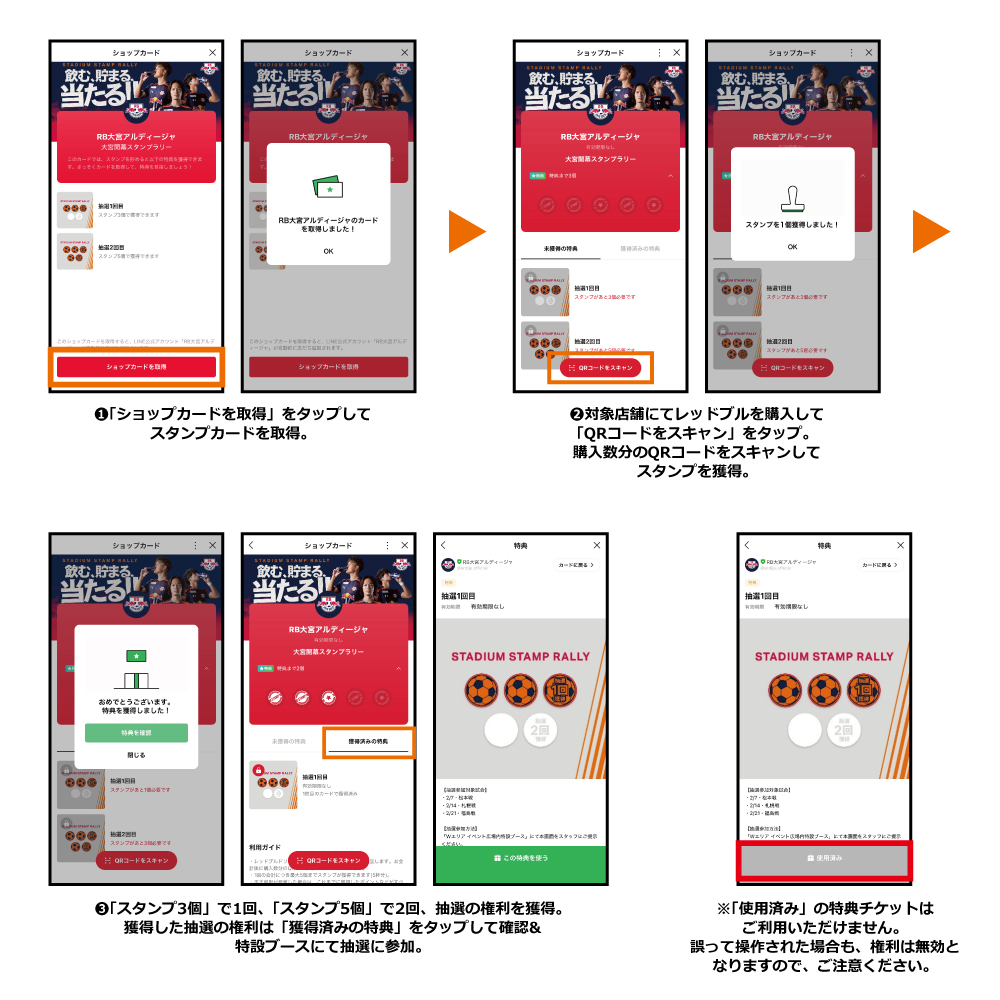 スタンプラリーは、「RB大宮アルディージャ公式LINE」の「ショップカード」のサービスを利用して実施します。ぜひこの機会に友だち登録して、スタンプラリーにご参加ください。(1) RB大宮アルディージャ公式LINEアカウントのショップカード(スタンプカード)を取得します。