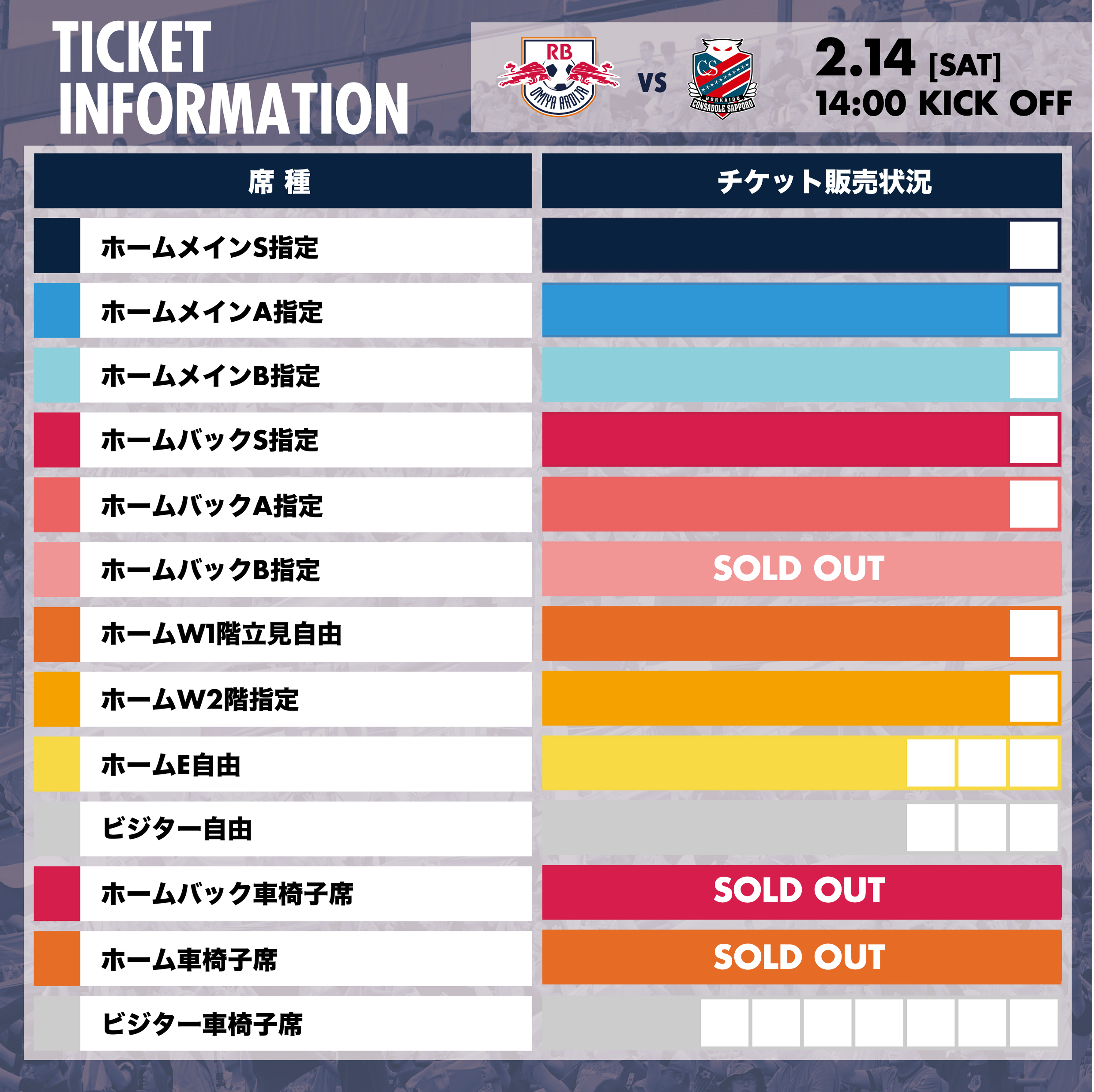 2/14・札幌戦のチケット販売について、以下の席種の販売予定枚数が終了となりましたので、お知らせします。