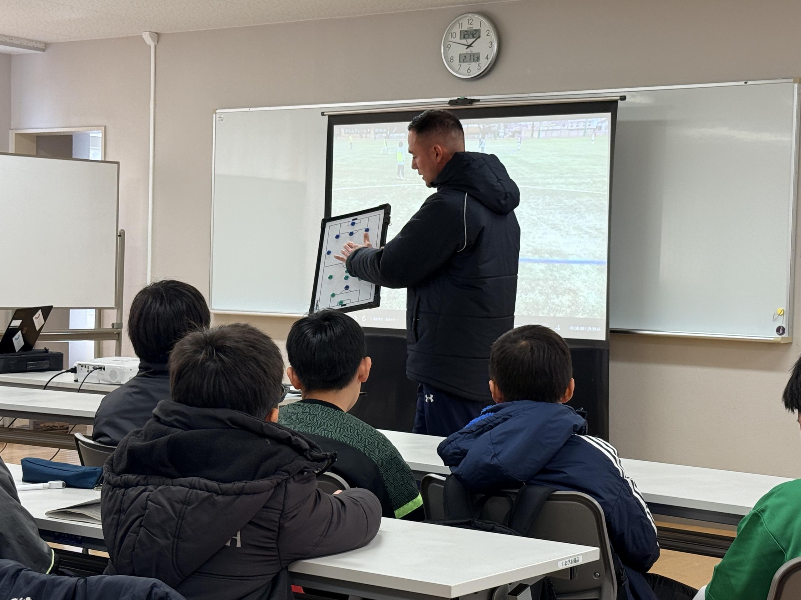 試合形式のトレーニングを撮影した映像を見ながら、プレーの改善について子どもたち自らがディスカッションし、RB大宮アルディージャのサッカースクールコーチがフィードバック、指導などの振り返りを実施。指導内容への理解を深めることだけでなく、子どもたち自身がプレーを客観的に見ることで、課題発見、解決力を養い、”考える力”を身につけることを目的としています。