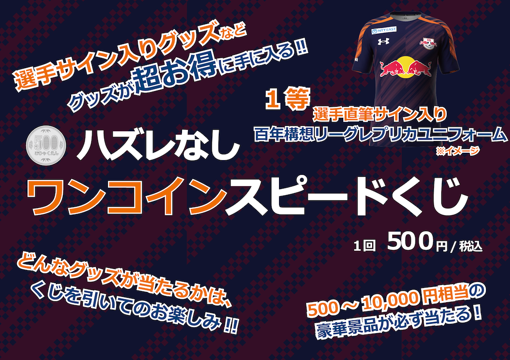 大人気の「ワンコインスピードくじ」を開催! 1等には選手サイン入りレプリカユニフォームをご用意! そのほか、豪華グッズがハズレなしで超お得にゲットできます!■実施時間:11:00~16:00頃