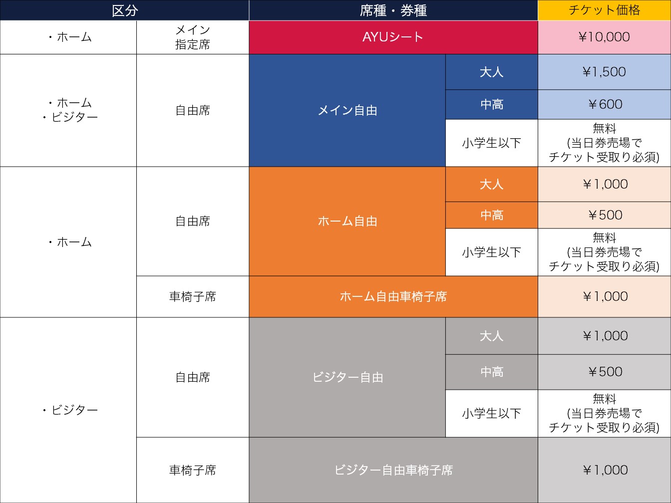 ※AYUシート、各種招待チケット、各試合の企画チケット、絆カードに関しては、アップグレード対応不可となります。あらかじめご了承ください。